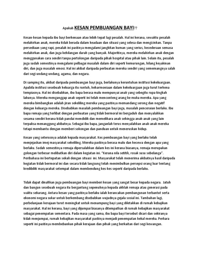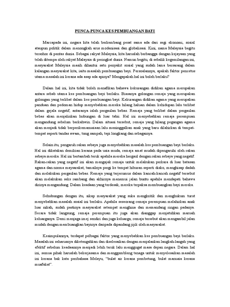 Kes pembuangan bayi yang semakin berleluasa sememangnya amat membimbangkan dan mencemaskan masyarakat. Remaja mestilah sedar bahawa perbuatan membuang bayi ialah. Faktor faktor pembuangan bayi 5.