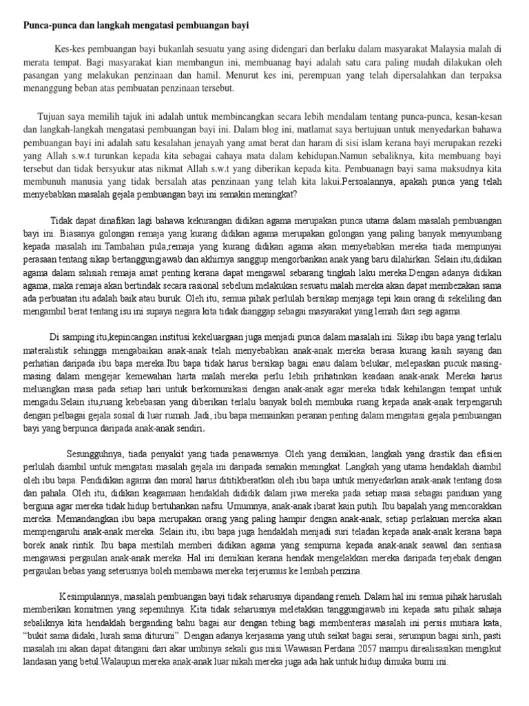 Baca petikan di bawah dengan teliti. Faktor lain seperti pengaruh media massa juga merupakan penyumbang kepada masalah pembuangan bayi. Justeru itu penulisan ini akan membincangkan tentang faktor faktor kesan-kesan sekaligus mecari jalan penyelesaian yang berkesan dan dapat digunakan dalam usaha untuk mebendung gejala pembuangan bayi ini.